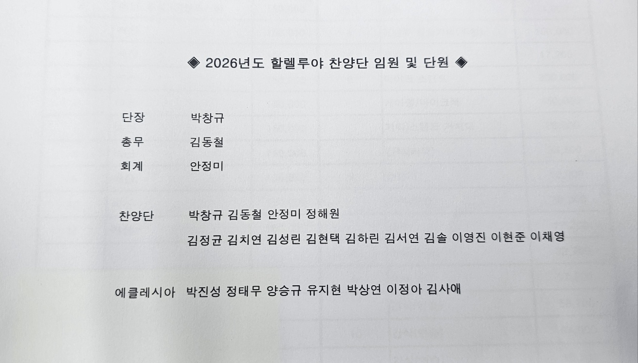 샬롬, 할렐루야 찬양단 여러분~~~ 2025년 12월 7일, 주님의 은혜 안에서 할렐루야 찬양단 총회를 아름답게 마쳤습니다. 참석해주신 모든 분들께 깊은 감사를 드립니다. 또한 부득이한 사정으로 함께하지 못하셨더라도, 각자의 자리에서 총회를 위해 마음 모아 기도해주신 단원 여러분께도 감사드립니다. 한 해 동안 찬양으로 교회를 섬겨주신 모든 단원분들께 진심으로 감사드립니다. 다가오는 새해에도 변함없이 주님 한 분만 바라보며, 기쁨과 감사의 마음으로 찬양으로 함께 섬기기를 소망합니다. 새해에는 단원 임명식이 예정되어 있으며, 할렐루야 찬양단 임원 및 단원 명단을 곧 공유해드리겠습니다. 특별히, 새해에는 김사애 집사님과 김정균 집사님께서 새롭게 할렐루야 찬양단으로 임명받아 함께하게 되었습니다. 두 분을 따뜻하게 환영하며, 앞으로 주님 안에서 더욱 귀하게 쓰임받도록 함께 기도해주시기 바랍니다. 올 한 해의 모든 일정 잘 마무리하시고, 다가오는 새해에는 더욱 풍성한 찬양예배로 헌신하며, 순종과 감사의 마음으로 주님께 나아가는 찬양단 되기를 소망합니다. 오늘 하루도 주님 안에서 평안하시고, 깊은 은혜가 충만한 시간 되시길 기도드립니다. 감사합니다.
