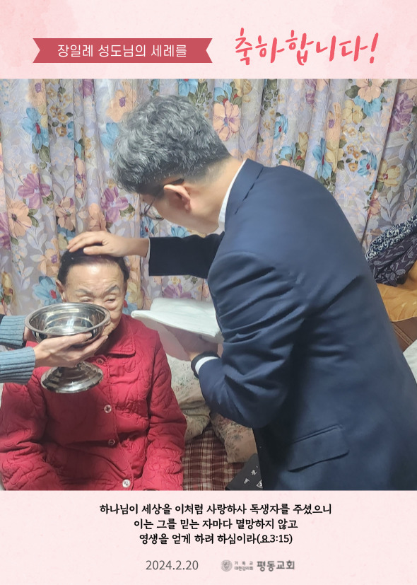 | 장일례 성도님 세례식 | 운영자 | 2024-02-28 | |||