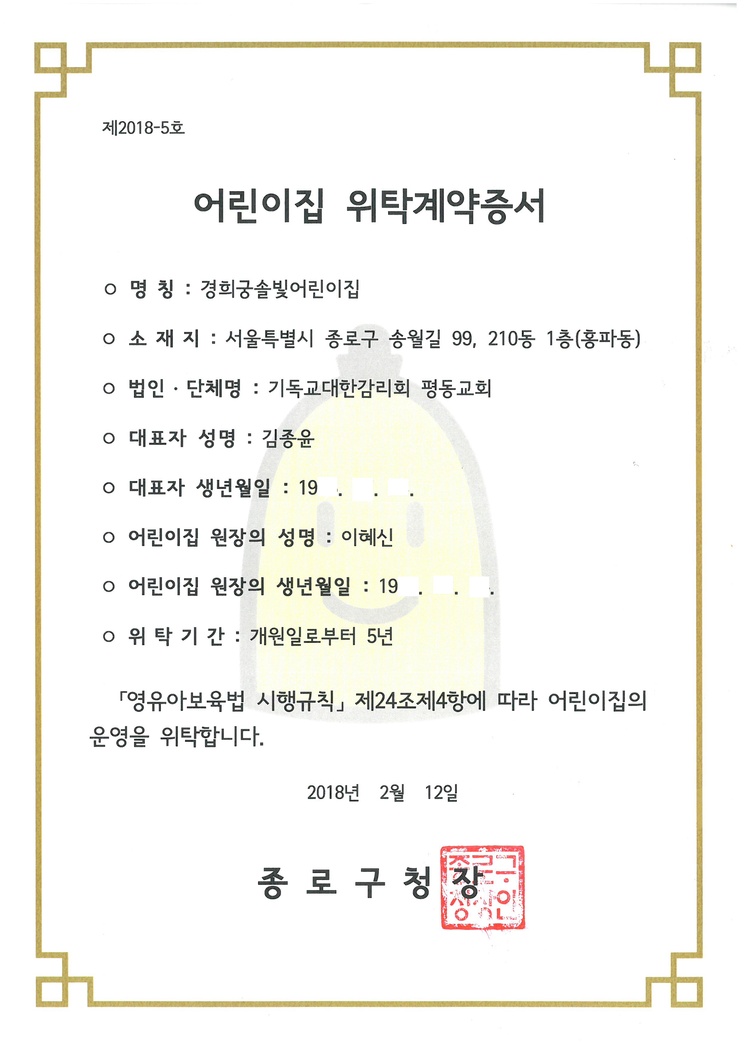 종로구청과 어린이집 위수탁계약을 하고 관련증서를 수령하였습니다.
