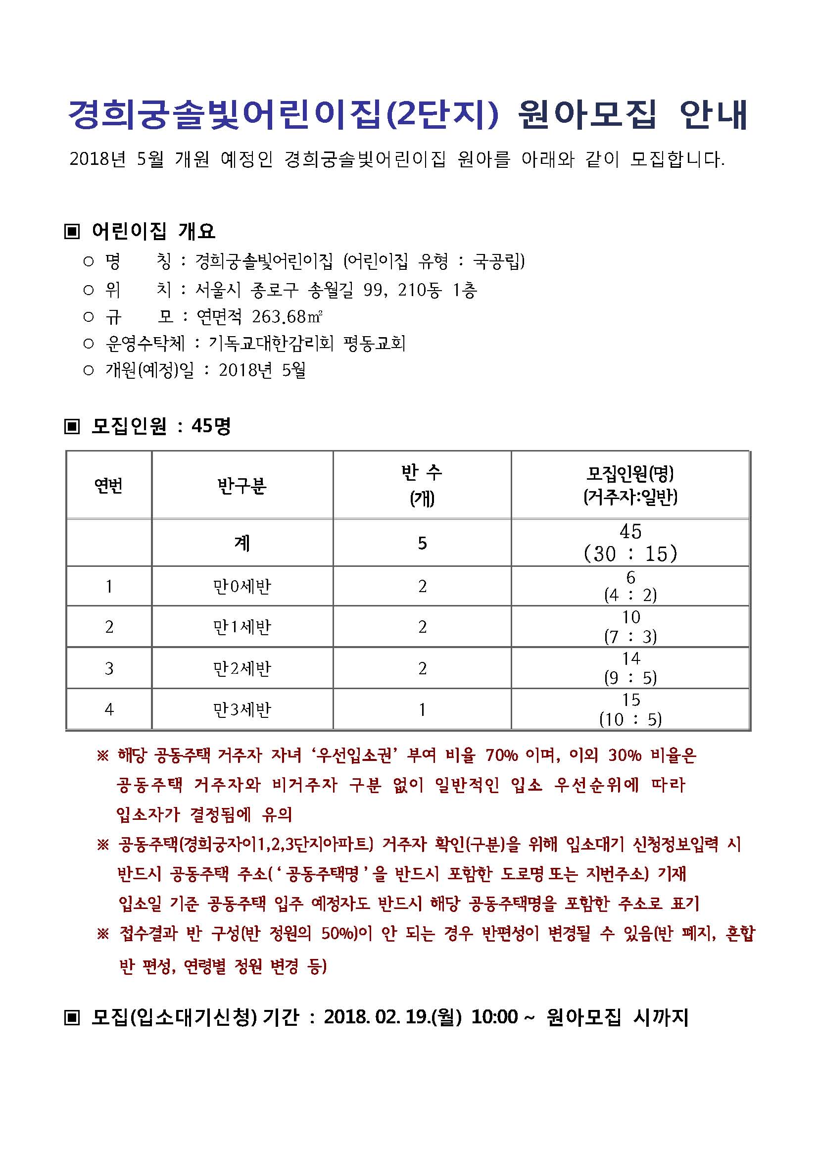 □ 명 칭 : 경희궁솔빛어린이집 □ 위 치 : 종로구 송월길 99, 210동 1층 □ 모집인원 : 45명 □ 개원예정일 : 2018년 5월