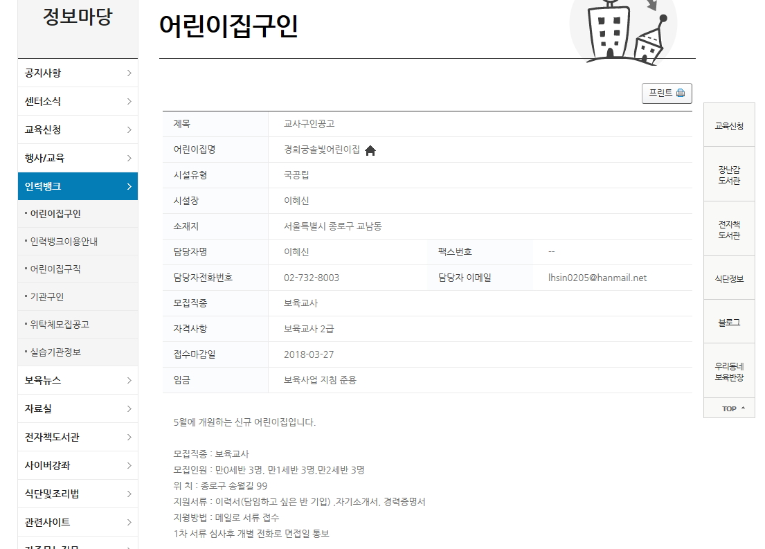 참고 - 서울육아종합지원센터 / 인력뱅크/ 어린이집구인