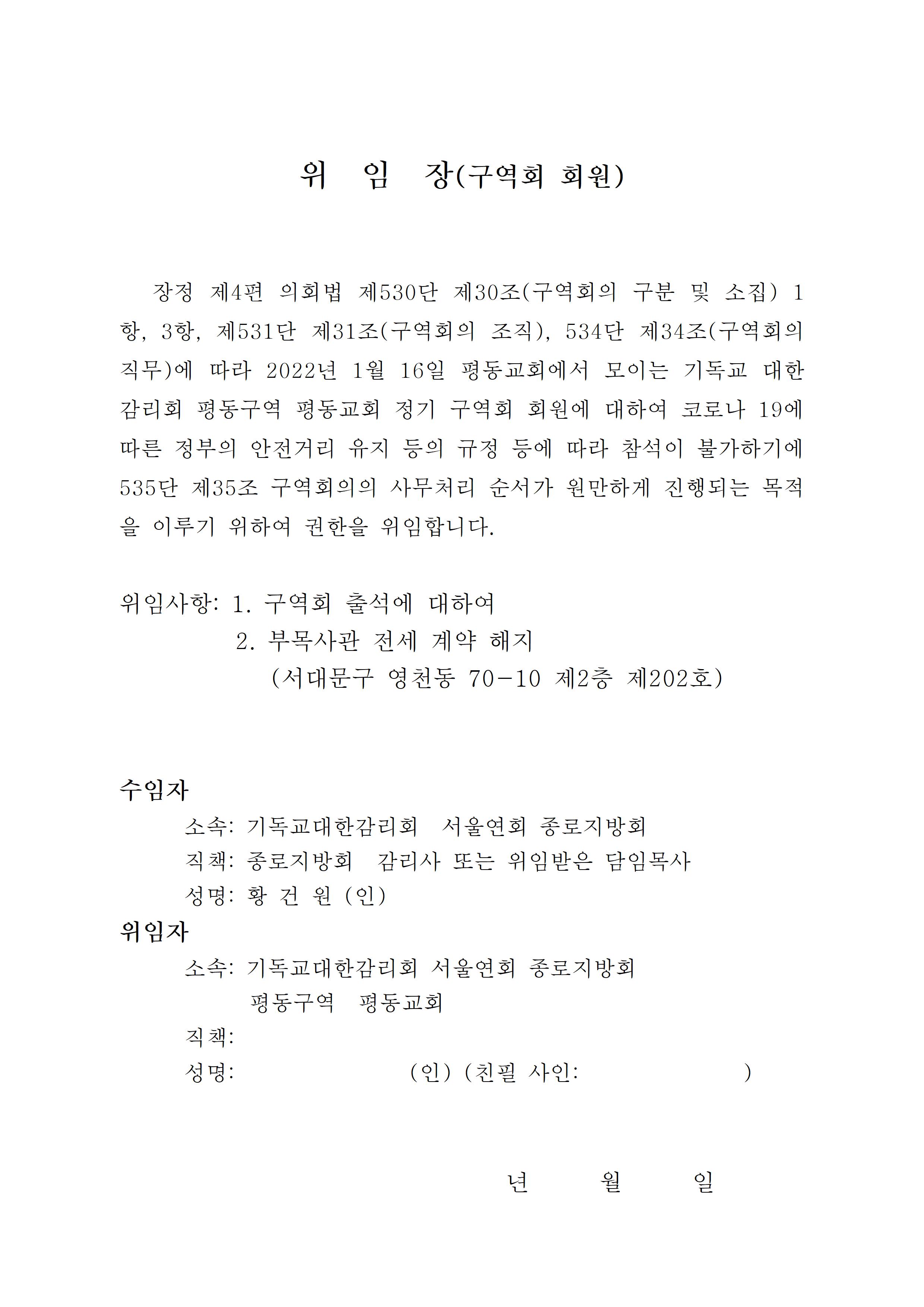 구역회 전에 위임장을 작성하여 사무실로 제출해 주시기 바랍니다.