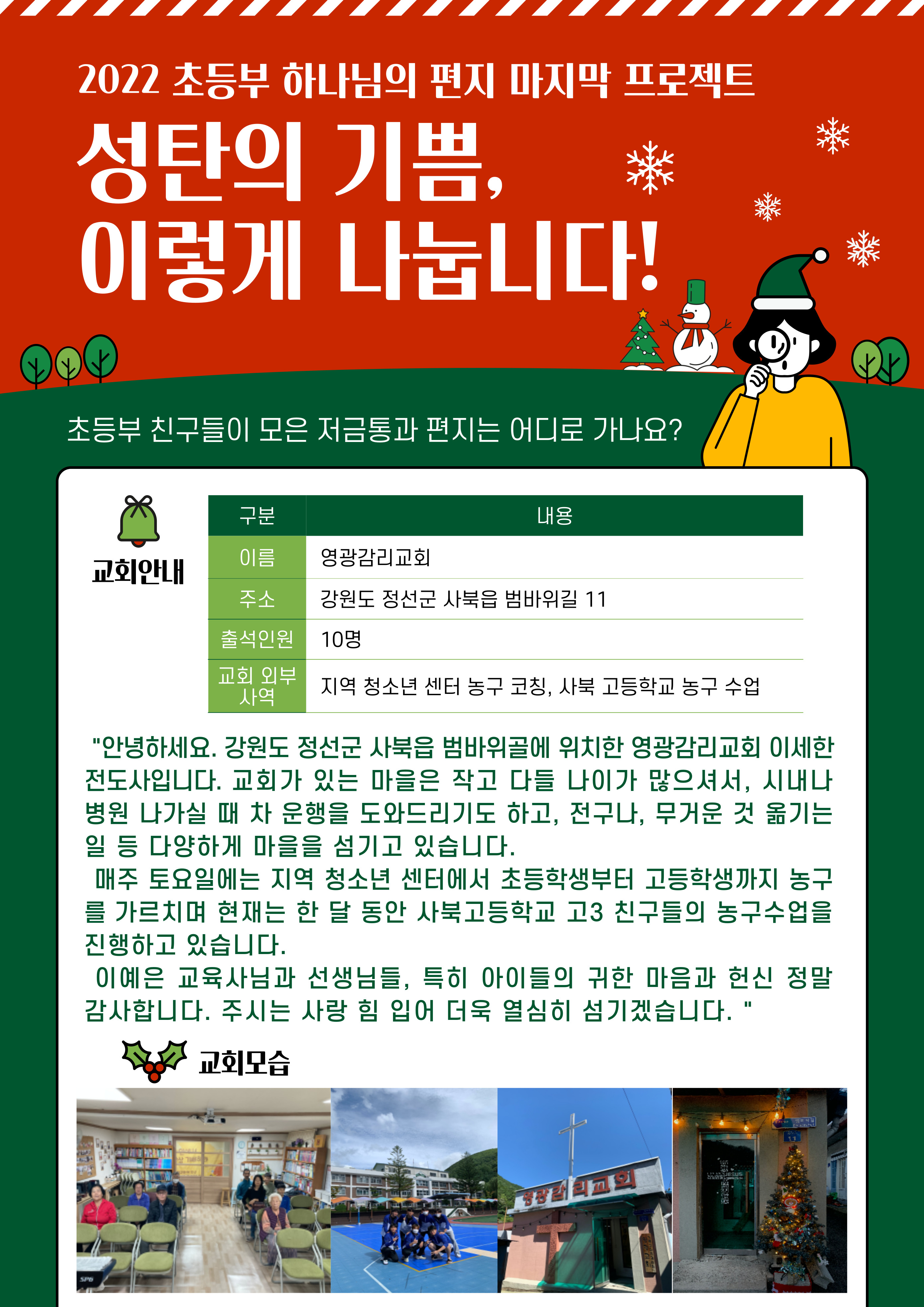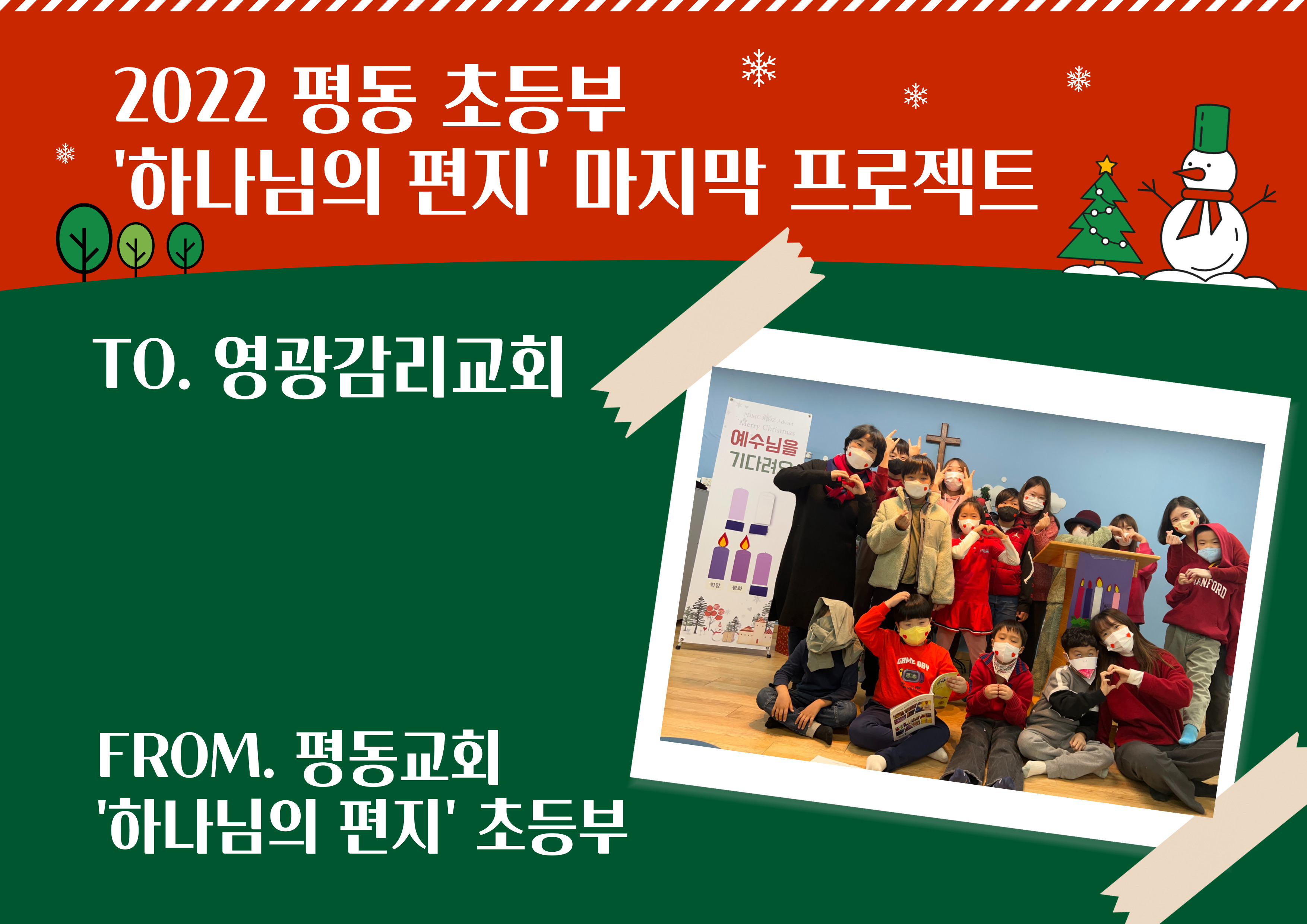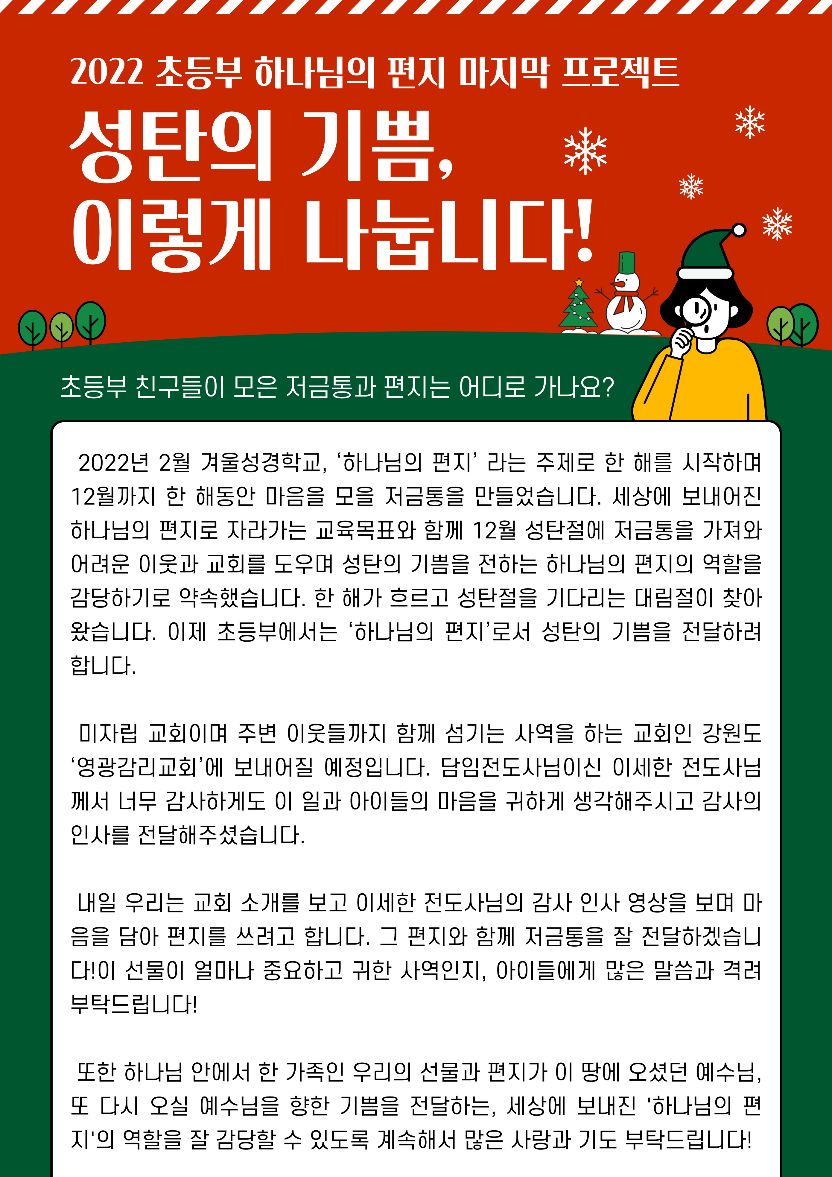 2022년 2월 겨울성경학교, ‘하나님의 편지’ 라는 주제로 한 해를 시작하며 12월까지 한 해동안 마음을 모을 저금통을 만들었습니다. 세상에 보내어진 하나님의 편지로 자라가는 교육목표와 함께 12월 성탄절에 저금통을 가져와 어려운 이웃과 교회를 도우며 성탄의 기쁨을 전하는 하나님의 편지의 역할을 감당하기로 약속했습니다. 한 해가 흐르고 성탄절을 기다리는 대림절이 찾아왔습니다. 이제 초등부에서는 ‘하나님의 편지’로서 성탄의 기쁨을 전달하려 합니다. |