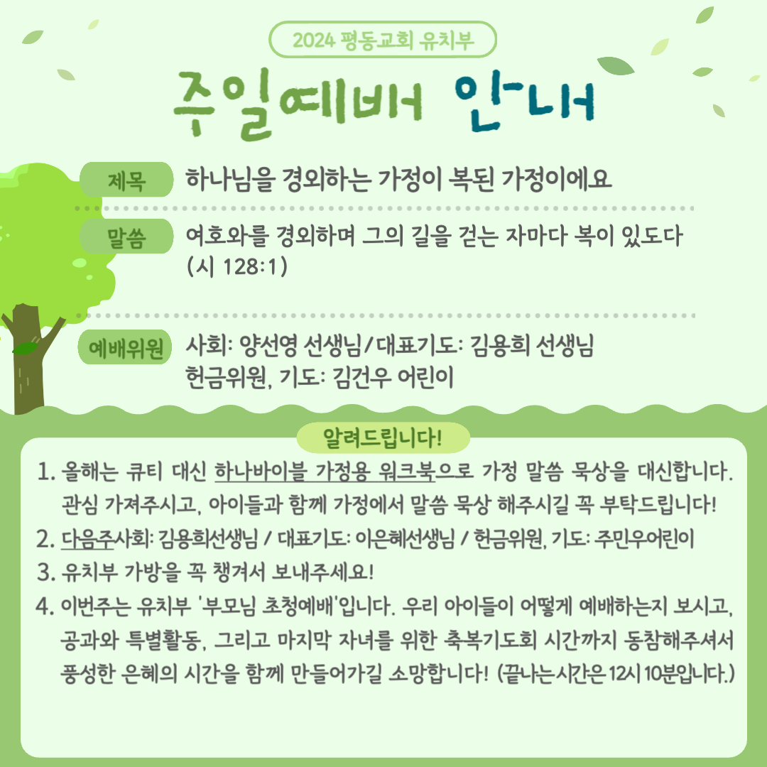 유치부 부모님 초청예배 안내