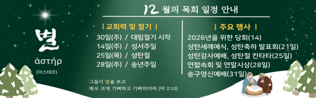 최근게시물 유치부 12월 14일 주일예배 유치부 12월 7일 주일예배 Daniel 청년부 2025.12.14 젊은예배 주보 초등부 2025.12.07 초등부 예배 초등부 초등부 12월 교육계획